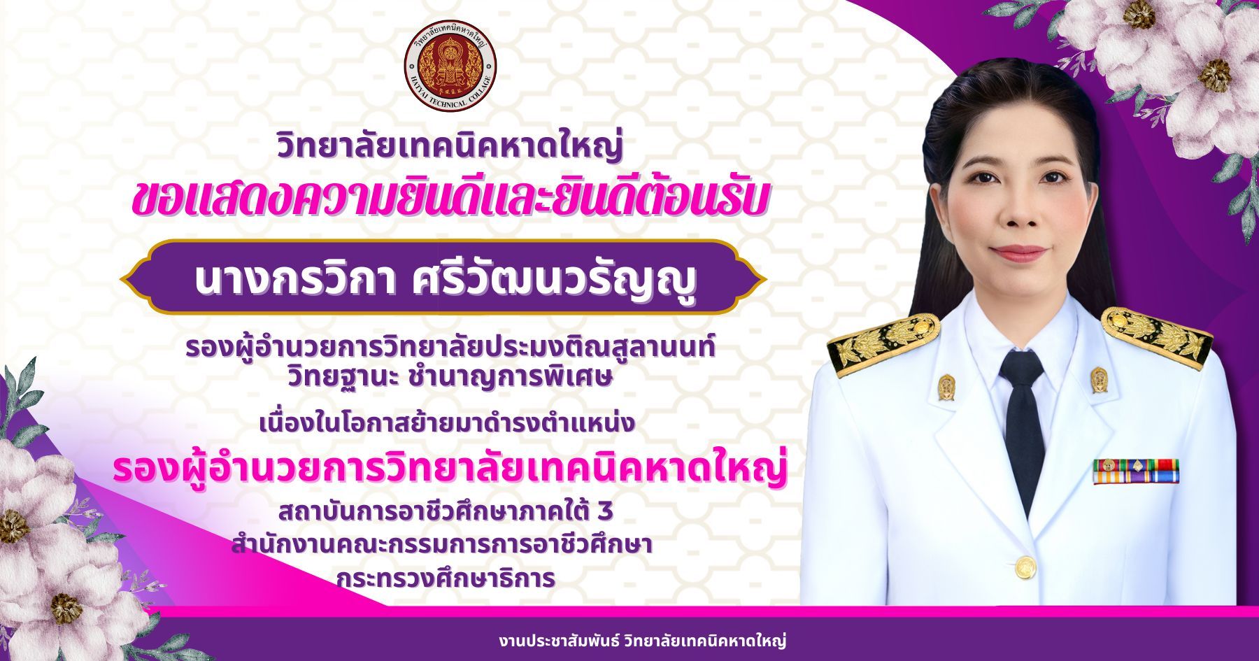 วิทยาลัยเทคนิคหาดใหญ่ ขอแสดงความยินดีและยินดีต้อนรับ "นางกรวิกา ศรีวัฒนวรัญญู" รองผู้อำนวยการวิทยาลั