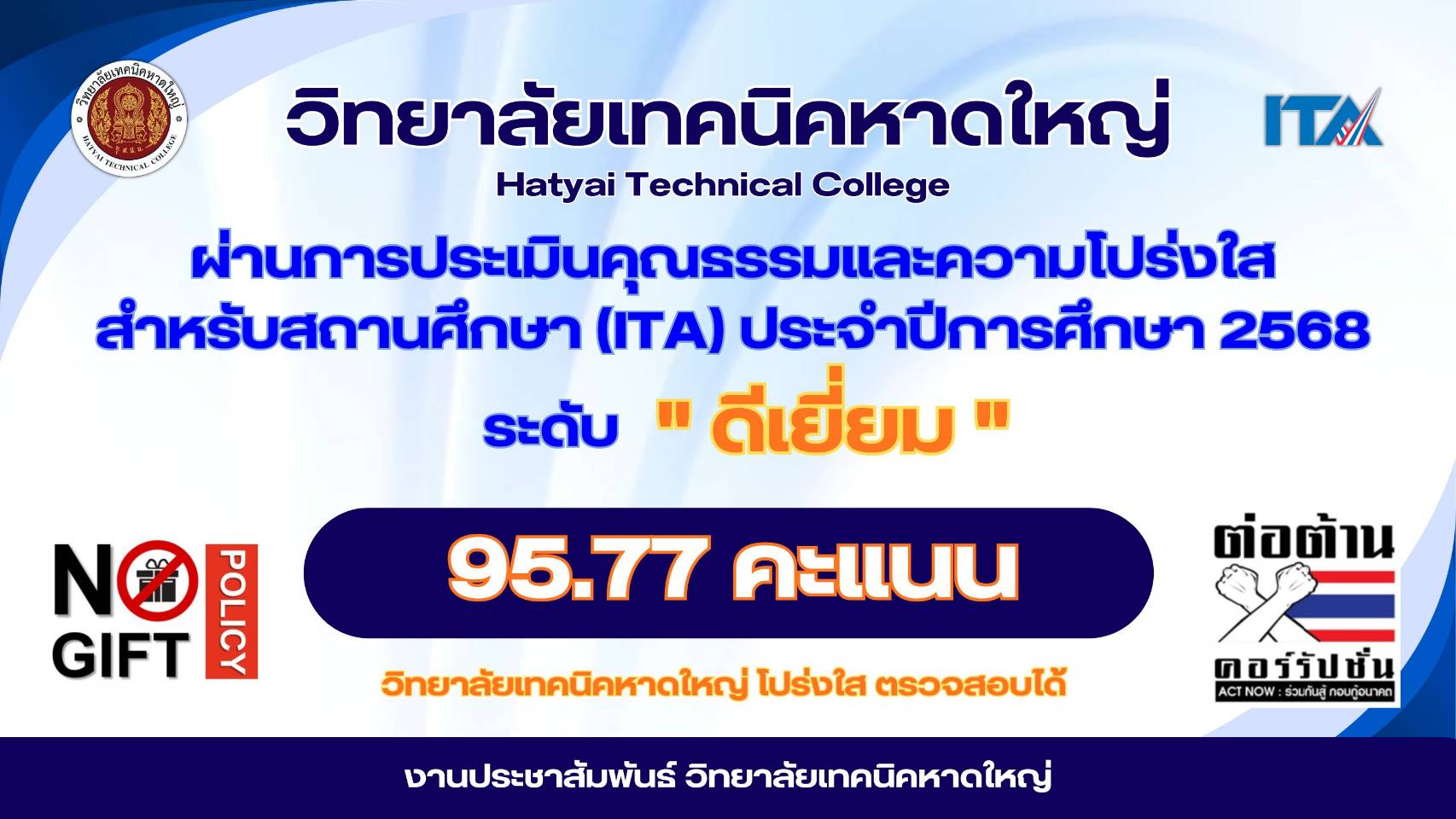 วิทยาลัยเทคนิคหาดใหญ่ ผ่านการประเมินคุณธรรมและความโปร่งใส สำหรับสถานศึกษา (ITA) ประจำปีการศึกษา 256