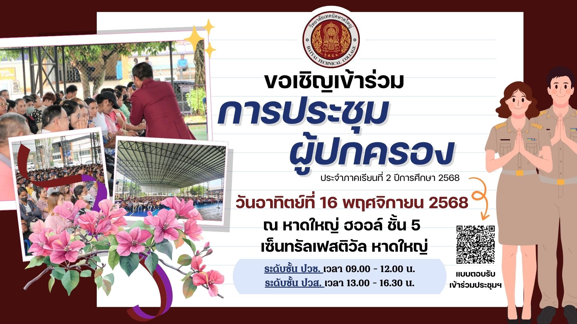 วิทยาลัยเทคนิคหาดใหญ่ ขอเชิญผู้ปกครองนักเรียน นักศึกษา ปวช.และ ปวส. ทุกระดับชั้น เข้าร่วมการประชุมผู